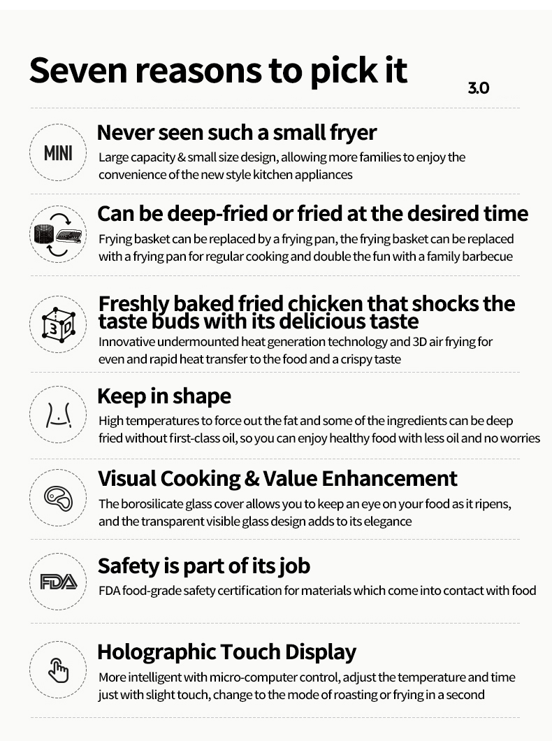 - Parts: Air frying tray frying basket baking tray grease tray high borosilicate glass cover